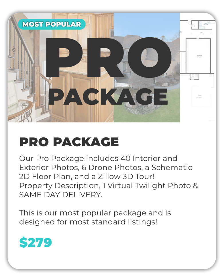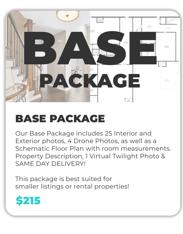 We offer simple flat rate pricing for our real estate images. For our 25 photos a we charge $175 plus tax, and for 40 photos we charge $195 plus tax, with floor plans included. No hidden fees, square footage or travel charges within our service area.